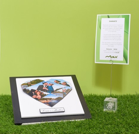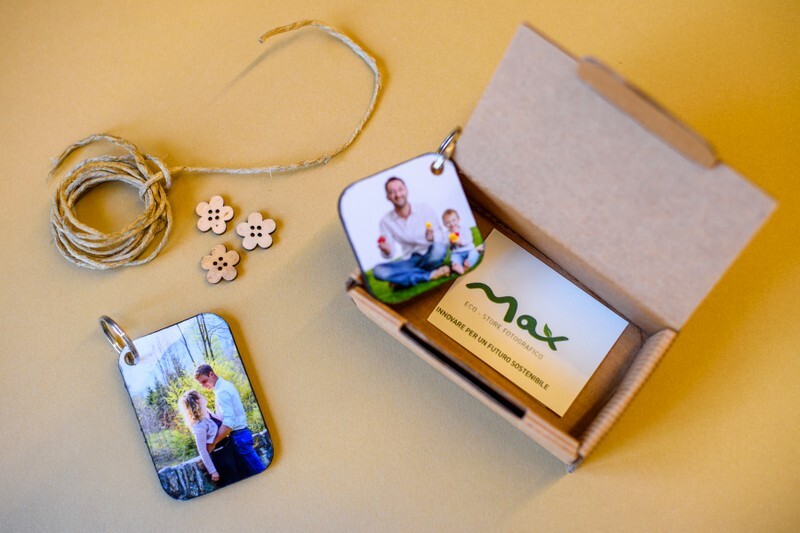Stampa fotografica applicata su due lati di una tesserina in legno stondato e laccato, completo di anello di sicurezza. Quadrato o rettangolare, confezionato con scatola Avana 11x15.