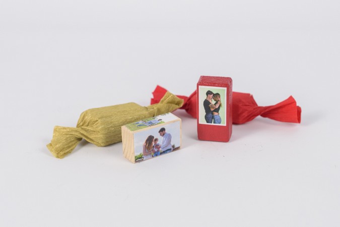 Stampa lasera applicata in decoupage sui lati di un blocchetto in legno stondato, colorato e laccato.